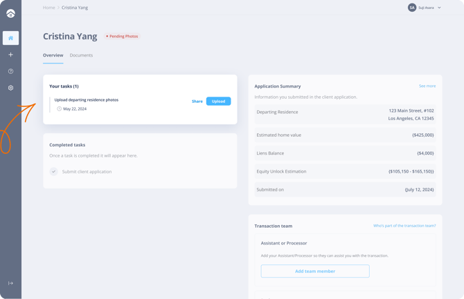 - Upload documents: Upload the necessary documentation listed below and client information to process the equity unlock loan.